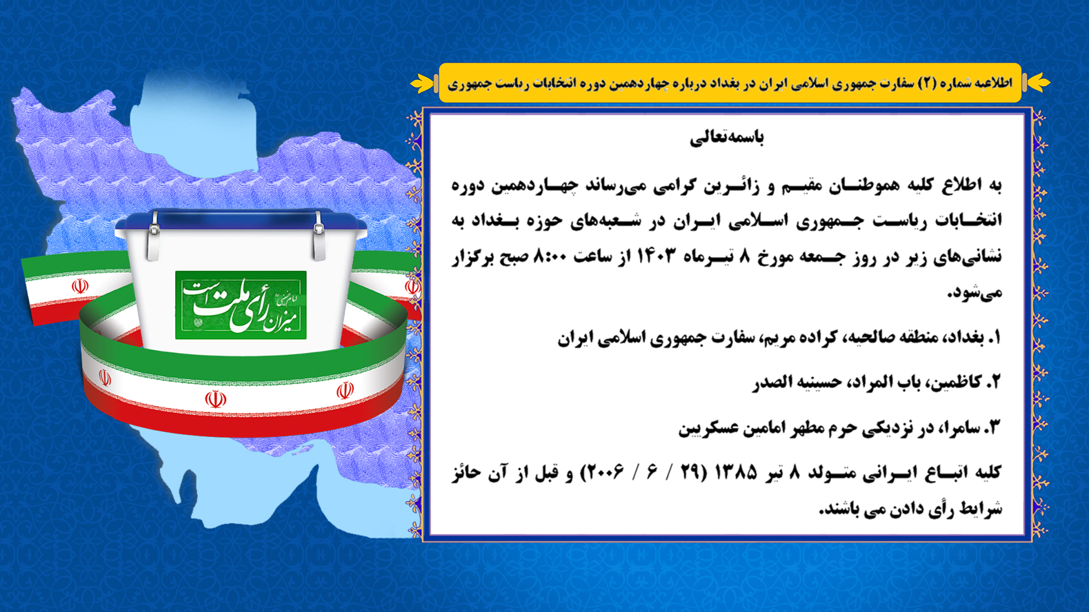 پیرو اطلاعیه شماره یک سفارت جمهوری اسلامی ایران در بغداد، به اطلاع کلیه هموطـنان مقیـم و زائریـن گرامی عتبات عالیات در عـراق میرسـاند چهاردهمیـن دوره انتخابات ریـاست جـمهوری اسـلامی ایـران در روز جـمعه مورخ 8 تیـرماه 1403 در شعب زیر (حوزه بغداد) برگزار میگردد: