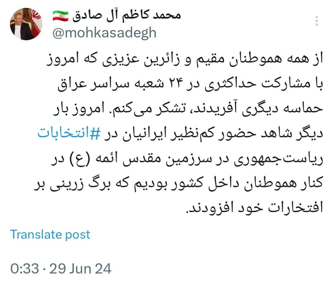 از همه هموطنان مقیم و زائرین عزیزی که امروز با مشارکت حداکثری در ۲۴ شعبه سراسر عراق حماسهای دیگر آفریدند، تشکر میکنم. امروز بار دیگر شاهد حضور کمنظیر ایرانیان در انتخابات ریاستجمهوری در سرزمین مقدس ائمه ع در کنار هموطنان داخل کشور بودیم که برگ زرینی بر افتخارات خود افزودند.